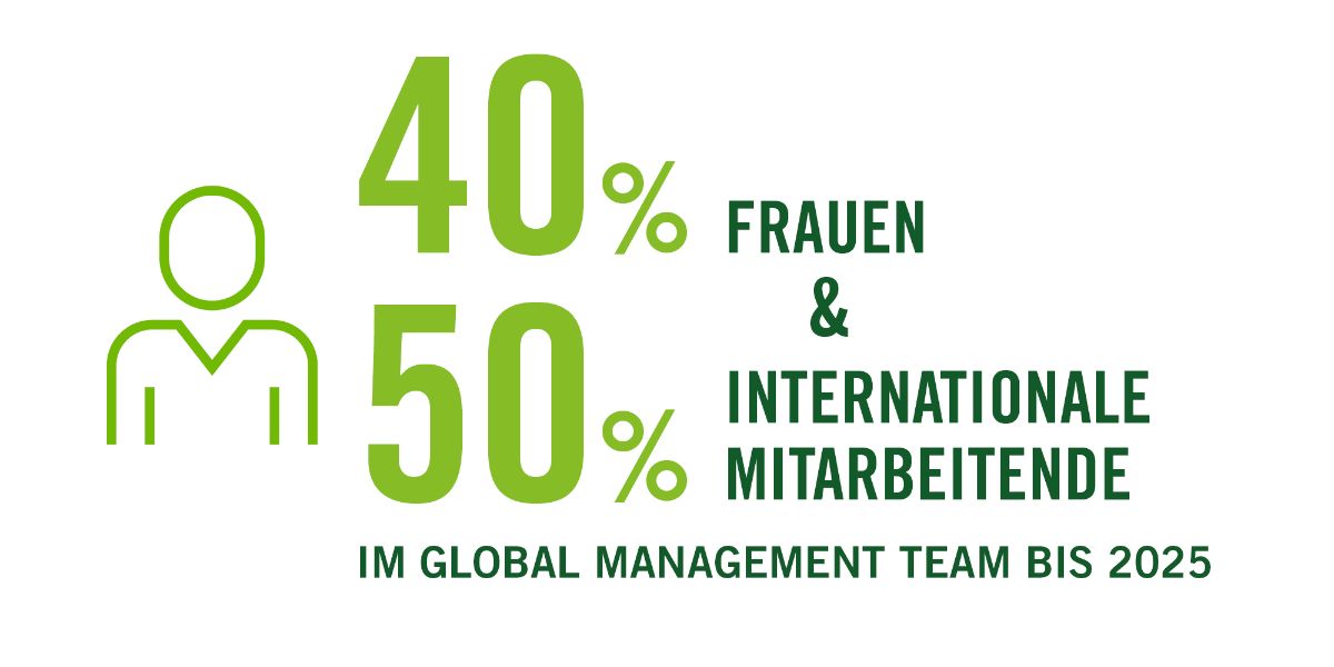 Diversität beginnt an der Spitze. Bis Ende 2025 wird unser Global Management Team zu mindestens 40 % aus Frauen und zu mindestens 50 % aus internationalen (nicht deutschen) Mitarbeitenden bestehen.*